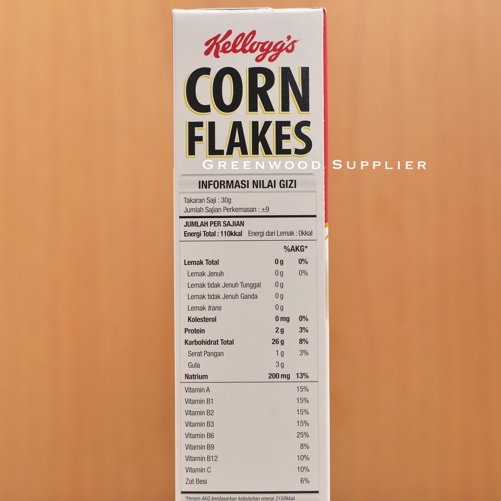 Kellogg's Corn Flakes® | Kellogg's Brands For more than a century, people have started their day with the original and best - Kellogg's Corn Flakes® cereal. Loaded with iron and 6 other vitamins and minerals, Kellogg's Corn Flakes cereal is a great way get your family's day off to a nutritious start. Kellogg's Corn Flakes® Cereal VIEW ALL FOODS Kellogg's Corn Flakes® cereal 4.7 (435) Kellogg's Corn Flakes® cereal - SmartLabel™ Kellogg's Corn Flakes® cereal .75 oz 00038000001956 Nutrition Ingredients Allergens Features & Benefits Company, Brand & Sustainability 80 Calories 0 g Sat Fat 150 mg Sodium 2 g Sugar Nutrition Facts Servings Per Container 1 Serving Size 1 Container (21 g)