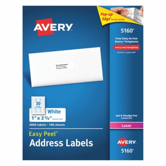 Avery Easy Peel Laser Address Labels, 1" x 2 5/8", White, 3000 Labels ... These Avery Easy Peel address labels work with Avery's free templates, providing you with convenient ways to design and align them for printing. These address labels make your most important messages stand out. Individual labels measure 1"H x 2 5/8"W. White color for an attractive look. Features a permanent adhesive backing for a secure bond.