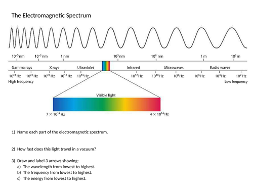 Electromagnetic spectrum | Definition, Diagram, & Uses types of electromagnetic radiation The entire electromagnetic spectrum, from the lowest to the highest frequency (longest to shortest wavelength), includes all radio waves (e.g., commercial radio and television, microwaves, radar ), infrared radiation, visible light, ultraviolet radiation, X-rays, and gamma rays.