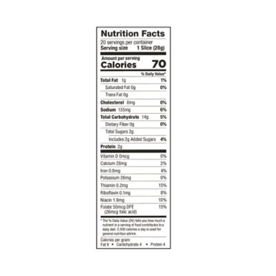 Healthy Life White Bread - Lewis Bake Shop Sodium 125mg 5% Total Carbohydrate 17g 6% Dietary Fiber 4g 14% Total Sugars 3g Includes 2g Added Sugars 4% Protein 4g Vitamin D 0mcg 0% Calcium 55mg 4% Iron 0.8mg 4% Potassium 32mg 0% Thiamin 0.2mg 15% Riboflavin 0.1mg 8% Niacin 1.8mg 10% Folate 39mcg DFE (21mcg folic acid) 10%