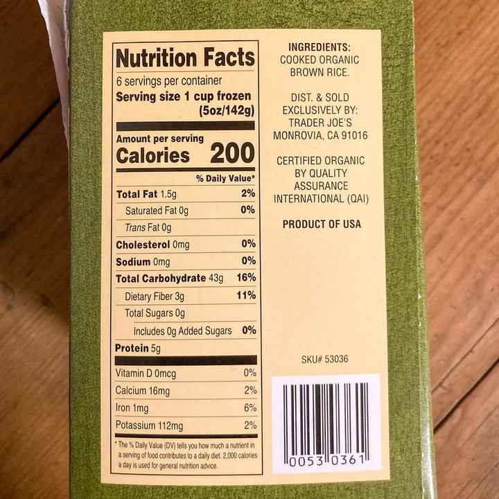 Frozen bag of brown rice Calories, Carbs & Nutrition Facts Trader Joe's brown rice Frozen bag of brown rice Serving Size: 1 cup 230 Cal 84% 49g Carbs 8% 2g Fat 9% 5g Protein Track macros, calories, and more with MyFitnessPal. Join for free! Daily Goals How does this food fit into your daily goals? Calorie Goal 1770 Cal 230/2000Cal left Fitness Goals: Heart Healthy Fat 65 g 2/67g left Sodium 2300 mg Nutrition Facts for Trader Joe's Organic Yellow Lentil & Brown Rice ... 0% Vitamin D 0mcg. 1% Calcium 10mg. 9% Iron 1.6mg. 10% Potassium 480mg. 0% Vitamin A 0mcg. 0% Vitamin C 0mg. *. The % Daily Value (DV) tells you how much a nutrient in a serving of food contributes to a daily diet. 2,000 calories a day is used for general nutrition advice. 29 Net Carbs Per Serving. › calories-nutrition › trader-joesCalories in Trader Joe's Brown Jasmine Rice and Nutrition Facts -... Feb 6, 2009 · Trader Joe's Brown Jasmine Rice Nutrition Facts Serving Size 1/4 cup dry (45 g) Amount Per Serving Calories 160 % Daily Values* Total Fat 1.00g 1% Saturated Fat 0.000g 0% Trans Fat 0.000g Cholesterol 0mg 0% Sodium 0mg 0% Total Carbohydrate 35.00g 13% Dietary Fiber 2.0g 7% Sugars 0.00g Protein 3.00g Vitamin D - Calcium - Iron - Potassium -
