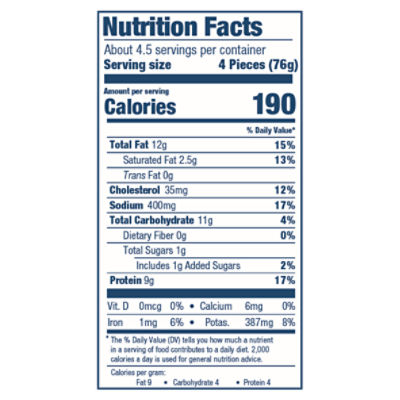 Dinosaur Nuggets Nutrition Facts - Eat This Much Calcium 20mg. 2%. How much Iron is in Dinosaur Nuggets? Amount of Iron in Dinosaur Nuggets: Iron 1.2mg. 15%. Fatty acids. Amino acids. * The Percent Daily Values are based on a 2,000 calorie diet, so your values may change depending on your calorie needs. Calories in Yummy Dino Buddies Chicken Breast Nuggets and ... - FatSecret Dino Buddies Chicken Breast Nuggets Nutrition Facts Serving Size 4 pieces (76 g) Amount Per Serving Calories 170 % Daily Values* Total Fat 9.00g 12% Saturated Fat 1.500g 8% Trans Fat - Cholesterol 20mg 7% Sodium 370mg 16% Total Carbohydrate 15.00g 5% Dietary Fiber 1.0g 4% Sugars - Protein 8.00g Vitamin D - Calcium - Iron - Potassium - Tyson Dino Nuggets: Calories, Nutrition Analysis & More | Fooducate For most people, this means less than 50 net carbs per day. Net carbs are calculated by subtracting fiber from total carbs. Example: A product with 26 grams of total carbohydrates and 9 grams of fiber will have 17 grams net carbs. Math equation: 26 - 9 = 17 IMPORTANT: Net carbs are per serving. Make sure you know your serving size or else you ...
